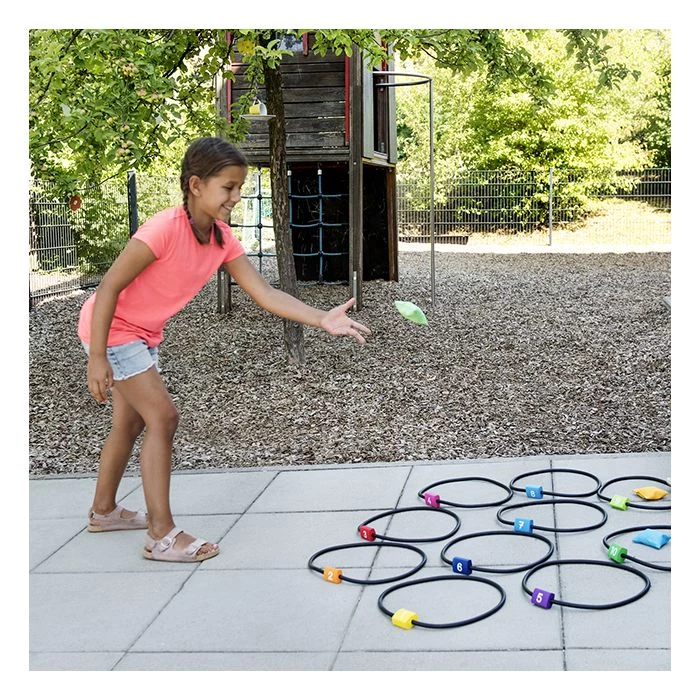 Tien bonte ringen om een parcours te maken in elke gewenste vorm. Gebruik het als hinkelspel of om punten te verzamelen door met de bonenzakjes te gooien.