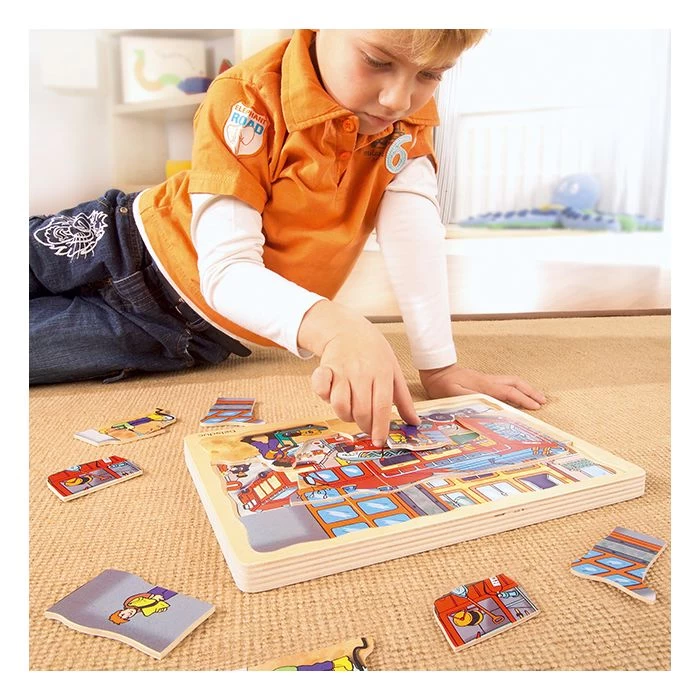 De houten lagen puzzel brandweer geeft kinderen op speelse wijze een duidelijk beeld over het werk van de brandweer. In 5 lagen worden verschillende fases van het blussen van een brand weergegeven.