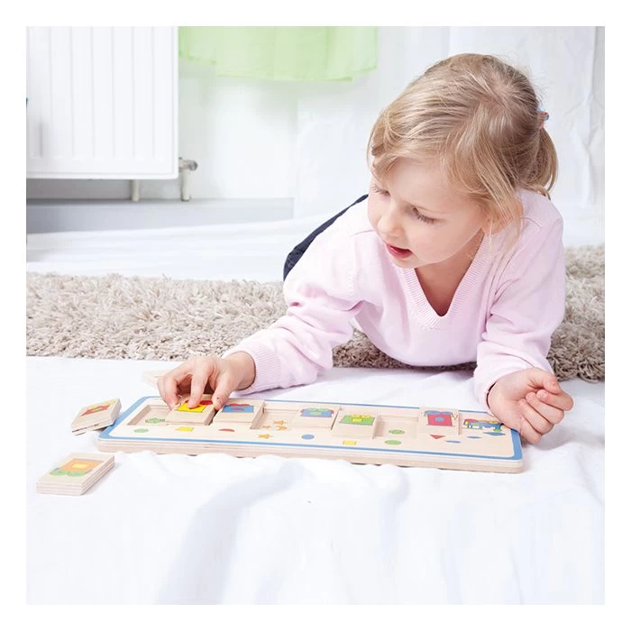 Leer de basis van vormherkenning met de houten legpuzzel vormentrein. Wat een leuke ramen heeft deze trein, herken jij al wat vormen?