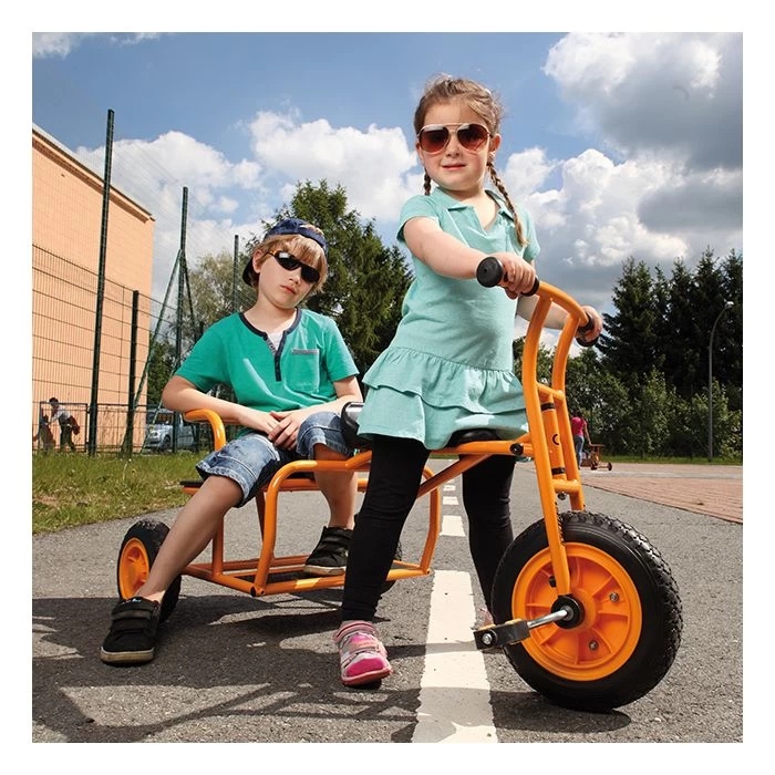 Deze driewieler taxi biedt ruimte tot wel drie kinderen. Eentje is de chauffeur en twee kunnen van het ritje genieten terwijl ze op de achterbank zitten.