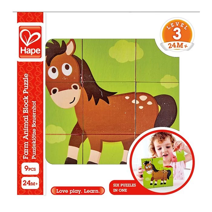 Iedere boerderij heeft knuffeldieren nodig! Voltooi de verschillende kanten van de puzzel om een eend, een koe, een varken, een paard, een schaap en een trotse haan te zien. Combineer de zes puzzels in één set blokken. Blokkenpuzzel boerderijdieren bestaat uit 9 kleurrijke blokken en is gemaakt van hoogwaardig, duurzaam hout.