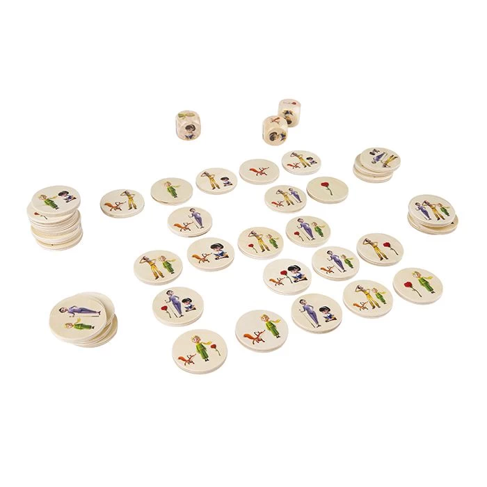Gooi de dobbelsteen en vind het houten stukje met de overeenkomende combinatie van karakters uit de animatiefilm De Kleine Prins.