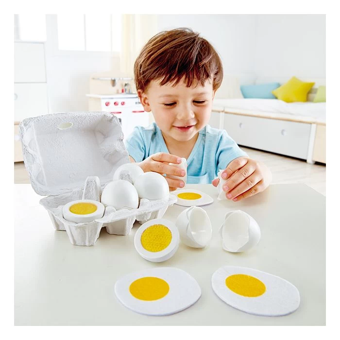 Lekker, een eitje bij het ontbijt! Wil je een gekookt ei of toch een gebakken ei? In deze eierdoos zitten zes speelgoed eieren: drie hardgekookt en drie gebakken. De eieren kunnen open om het rollenspel echter te maken en nog meer plezier te beleven met deze speelgoed eieren.