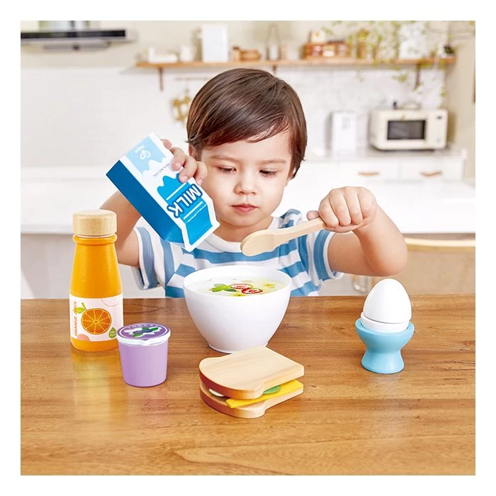 Bereid je voor op de belangrijkste maaltijd van de dag, het ontbijt! 1 kom, 1 houten ontbijtgranen, 1 bosbessenyoghurt, 2 sneetjes brood, 1 melk, 1 sap, 1 eierdopje, 1 ei, 1 lepel, 1 tomatenvilt, 1 slavilt, 1 kaasvilt