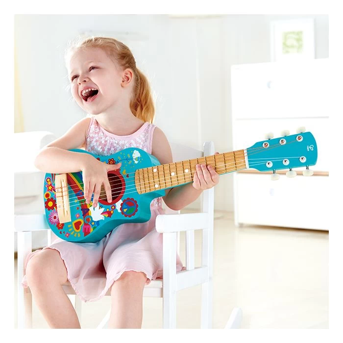 Met deze houten flower power speelgoed gitaar kan je kindje gitaar spelen als een echte hippie. De flower power gitaar is een kruising tussen een klassieke gitaar en een ukelele en is groot genoeg voor jonge kindjes die een instrument willen leren te bespelen.