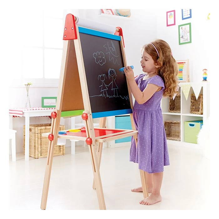 Dit in hoogte aanpasbaar dubbelzijdige tekenezel is perfect voor je kleine kunstenaar! Heeft 2 zijden met aan iedere zijde een tekenbord: 1 krijtbord en 1 magnetisch whiteboard, met veel tekengerei. Doordat de tekenezel dubbelzijdig is kan er tegelijkertijd met een speelkameraadje gebuik van worden gemaakt.