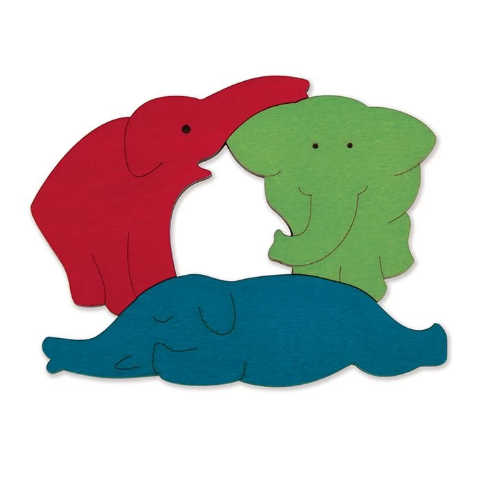 De olifanten puzzel van George Luck bestaat uit 6 in elkaar grijpende stukken binnenin een frame uit 3 lagen.