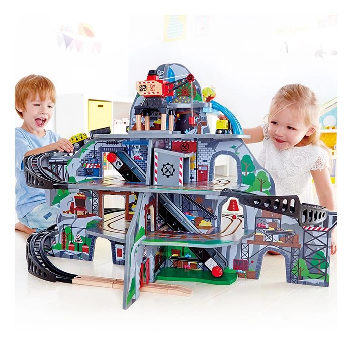 Rij met je trein vanaf het oppervlak van een machtige berg de drukke mijn binnen! Deze speelset uit meerdere etages levert de ultieme houten spoorweg-ervaring en komt met een watervaltunnel, een obstakelbrug, een kraan, een transportband en een reparatiewerkplaats!