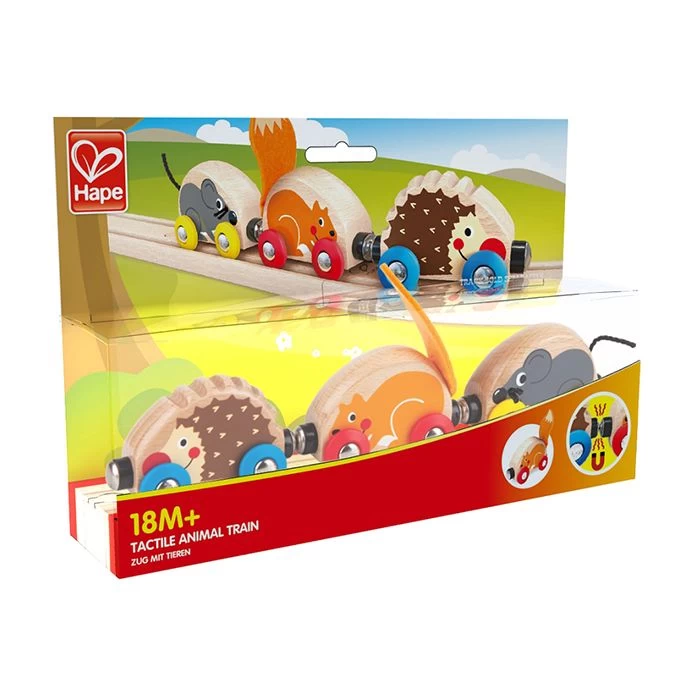 Deze dierentrein zal kleine ogen en handen in verrukking brengen. De egel is voorzien van een leuk aan te raken rug met zaagtanden, de eekhoorn heeft een zachte vilten staart en de muis heeft prachtige lange snorharen op zijn snuit.