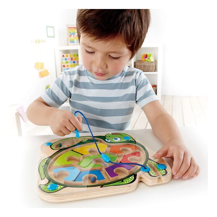 Magneetspel schildpad, voor de fijne motoriek, hand-oog coördinatie en kleurherkenning. Afbeelding van hout, afgedekt met een kunststof plaat.