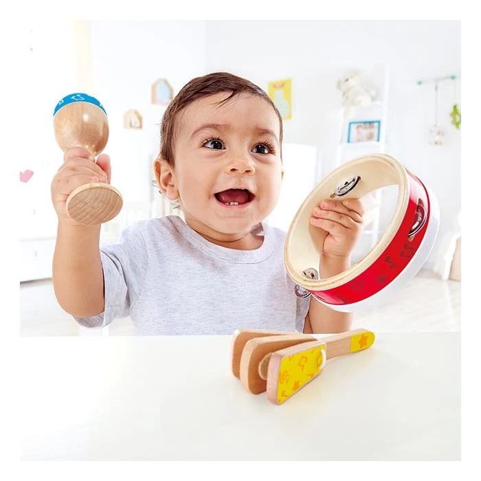 Sla een stevig ritme met deze driedelige percussieset! Bevat een tamboerijn, een maraca en een klapper.