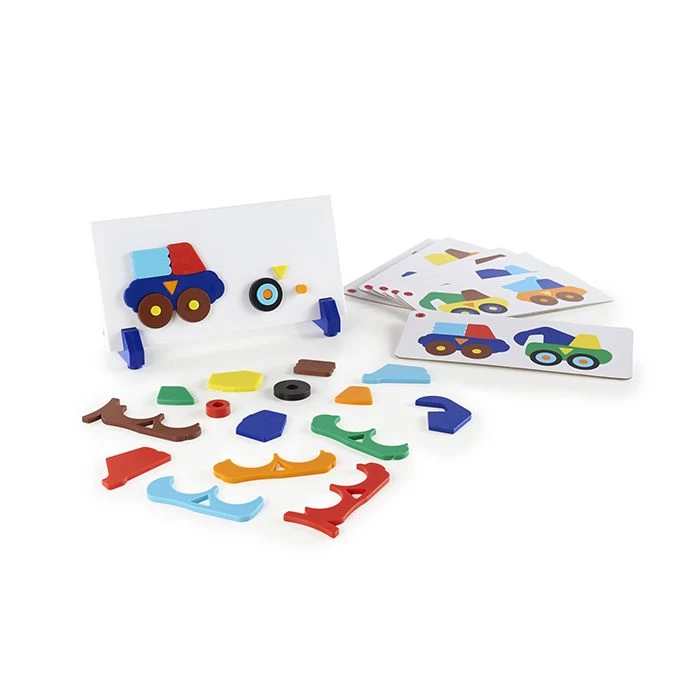De set bestaat uit 44 onderdelen. De onderdelen van sorteren en matchen bouwvoertuigen zijn allemaal magnetisch. Deze onderdelen moeten aan het bord worden bevestigd. De magneten houden de magnetische onderdelen op zijn plaats.