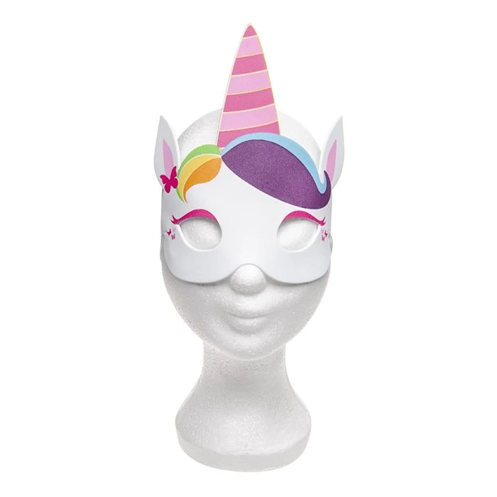Een oogmasker gemaakt van foam, in de vorm van een eenhoorn. Het masker wordt bevestigd door middel van het aangehechte elastiekje.