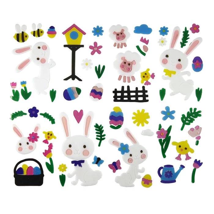De stickervellen bevatten verschillende figuren, zoals een paashaas, bloemetjes, gras, paaseieren, schaapjes, kuikentjes, een hekje, bijtjes, tulpjes, mandje met paaseieren, vogelhuisje, vlindertjes, gieter, zonnetje en wolkjes. Er zijn verschillende soorten en maten van de figuren.