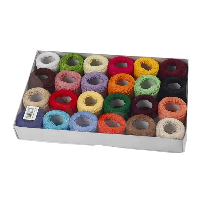 Sterk, enkeldradig katoengaren / borduurdraad. Gebruik haaknaald nr. 1.75 Set van 24 kleuren.