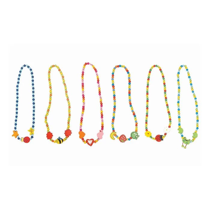 Set met een vrolijke halsketting en een armband met leuke vormpjes. Gemaakt van houten kralen aan een elastisch koord.