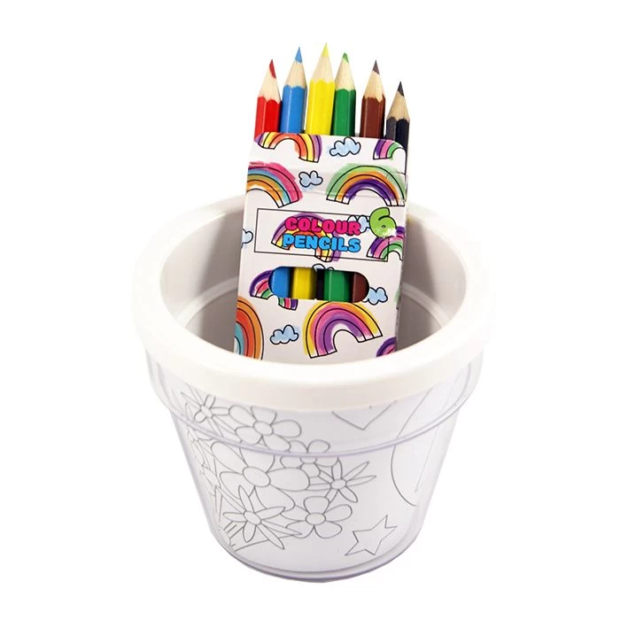De knutsel bloempot van kunststof is dubbelwandig. Bij de bloempot leveren we 4 kleurplaten en 6 kleurtjes.