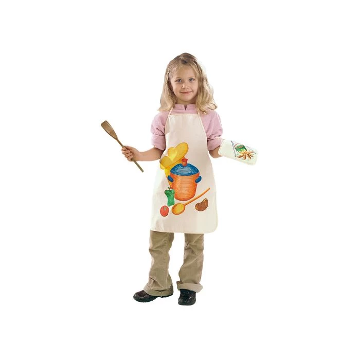 Maak je eigen keukenschort van katoen. Teken er iets moois op en kleur het in met textielverf en/of textielstiften, daarna lekker iets bakken! Het schortje wordt blanco geleverd.