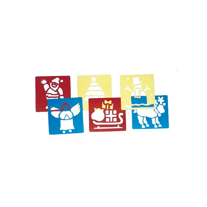 Knutsel sjablonen set van 6 verschillende kerstfiguren. Kerstboom, engel, sneeuwpop, rendier, kerstman, arreslee.