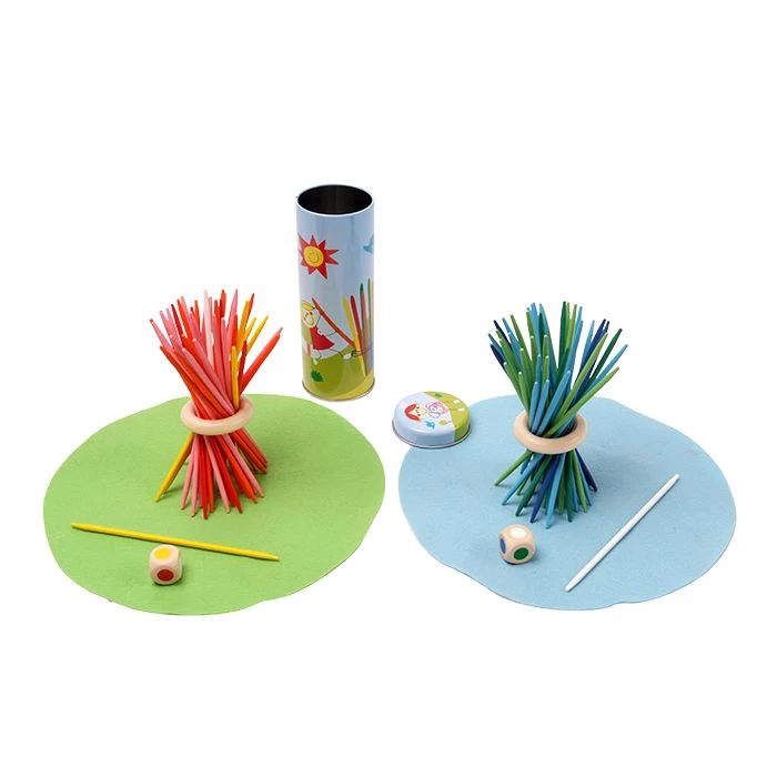 Een compact mikadospel in een handig blik! De dobbelsteen bepaalt van welke kleur je een stokje mag pakken.