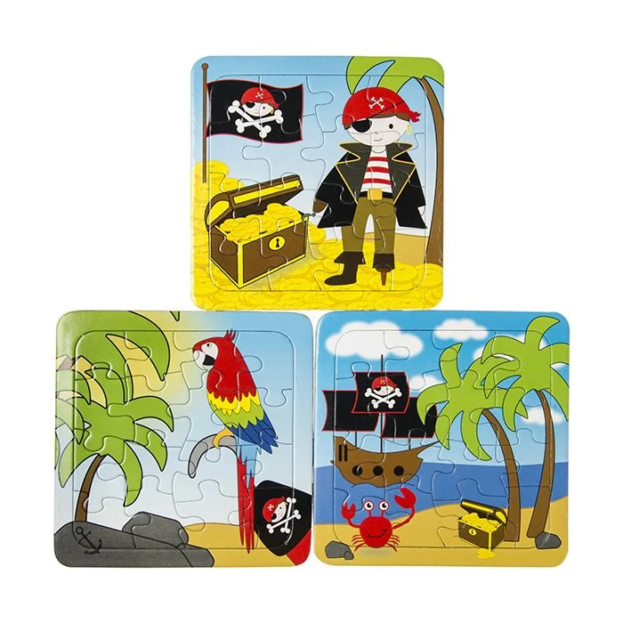 Kartonnen puzzel met 16 stukjes in een frame in 3 verschillende piraat afbeeldingen, te weten; piraat, papagaai of krab.