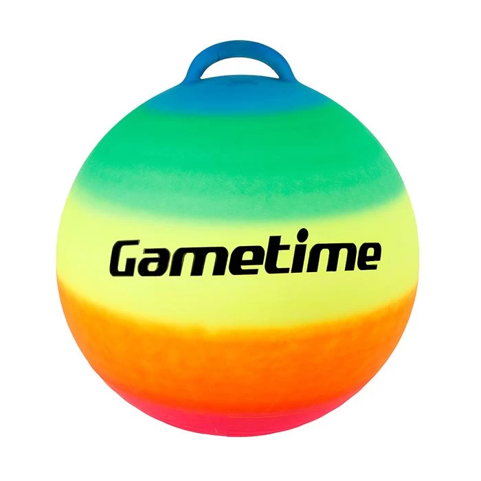 Deze skippybal heeft een diameter van 55 cm en heeft vrolijke regenboogkleuren.