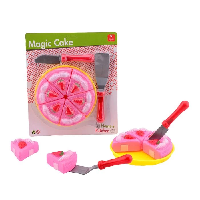 De taart set bestaat uit: 6 taartpunten van kunststof met klittenband aan beide zijden, 1 kunststof geel onderbord, 1 kunststof speelgoed spatel en 1 kunststof speelgoed mes.