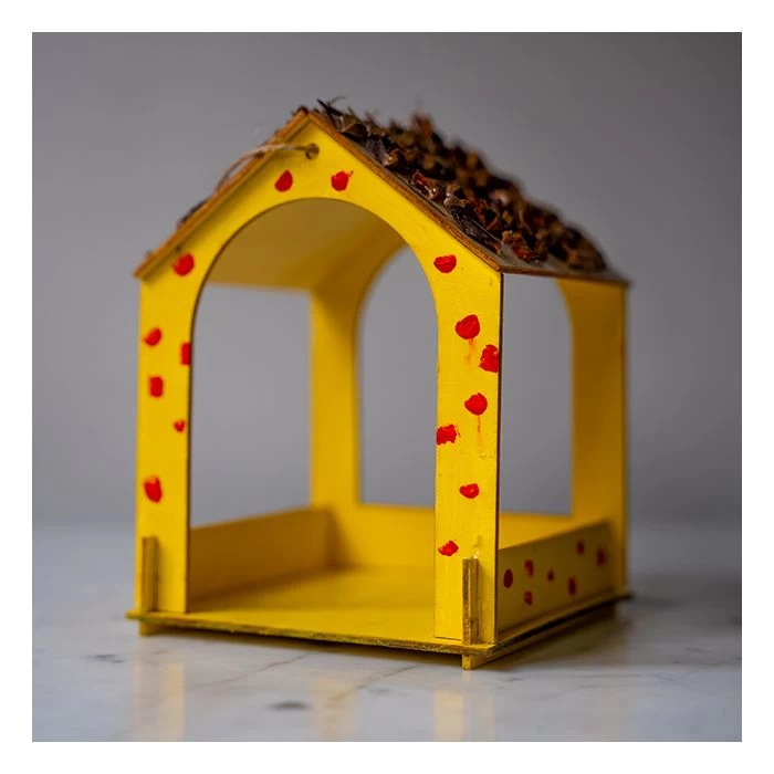 Na het schilderen en lakken hang je het huisje gemakkelijk op met het bijgevoegde touwtje. Zoek een geschikt plekje uit in de tuin, strooi wat vogelvoer of fruit in het huisje, en wachten maar!