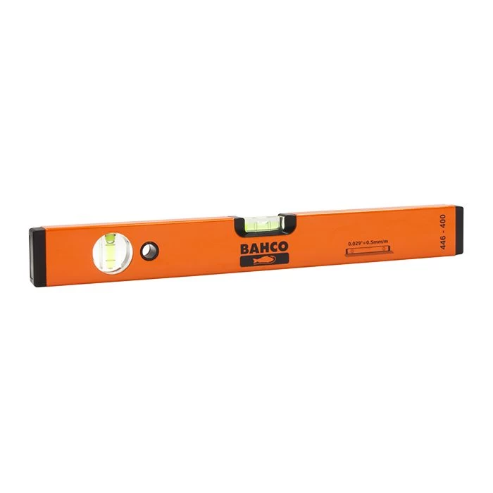 Rechthoekig alum. buisprofiel, met verhoogde kunststof eindkappen. Tonvormige, onbreekbare libellen. Horizontale libel met vergrotingslens en lichtgevend.
