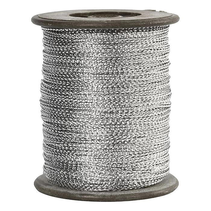 Een rol van 100 meter lang zilver koord. De dikte van het koord is 0,5 mm.