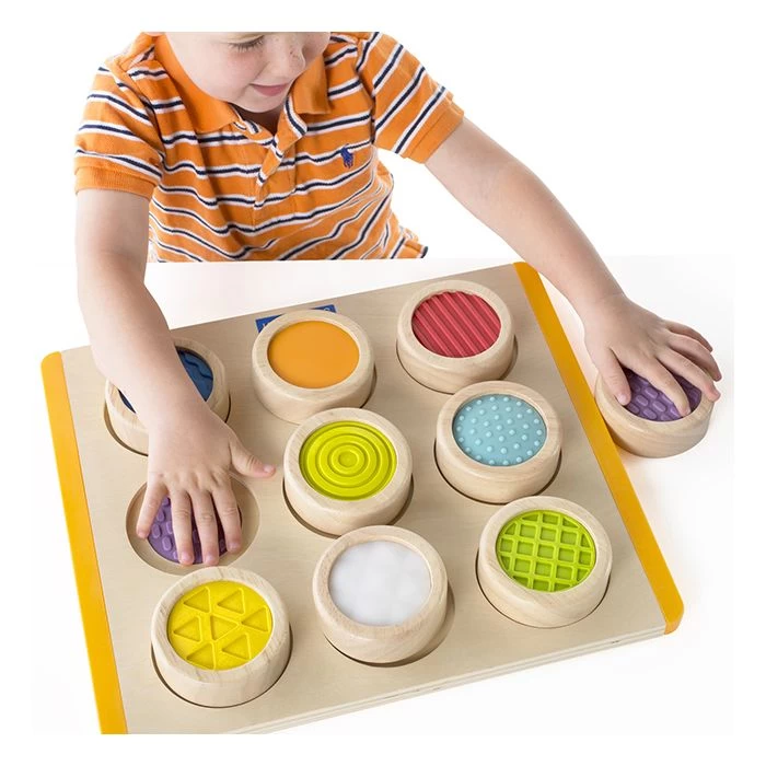 Nieuwsgierige peuters draaien de tastbare puzzelstukjes om om te voelen en te identificeren. De kleurrijke puzzelstukken hebben ieder een unieke structuur; ribbels, nopjes, gladde oppervlakken of zacht pluche etc. De negen verschillende puzzelstukken passen bij een corresponderende plek op het stevige houten puzzelbord. Oefen geheugen en patroonvaardigheden doormiddel van tastzin met dit leerzame matchingspel. Deze educatieve tastzin puzzel is geschikt voor thuis, maar ook voor op een kleuterschool of kinderopvang. Deze educatieve puzzel van Guidecraft is geschikt voor kinderen van 2 jaar en ouder.