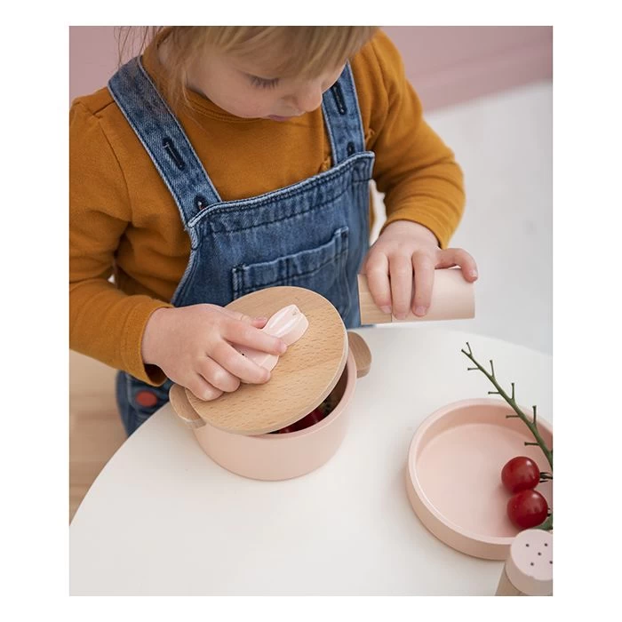 De houten speelgoed kookset konijn bestaat uit een pot, een pan, een peper- en zoutstel, lepel en vork. Alleen nog wat verbeelding toevoegen en je tovert de lekkerste gerechten op tafel!