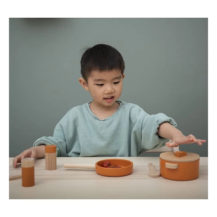 De houten speelgoed kookset vos bestaat uit een pot, een pan, een peper- en zoutstel, lepel en vork. Alleen nog wat verbeelding toevoegen en je tovert de lekkerste gerechten op tafel!