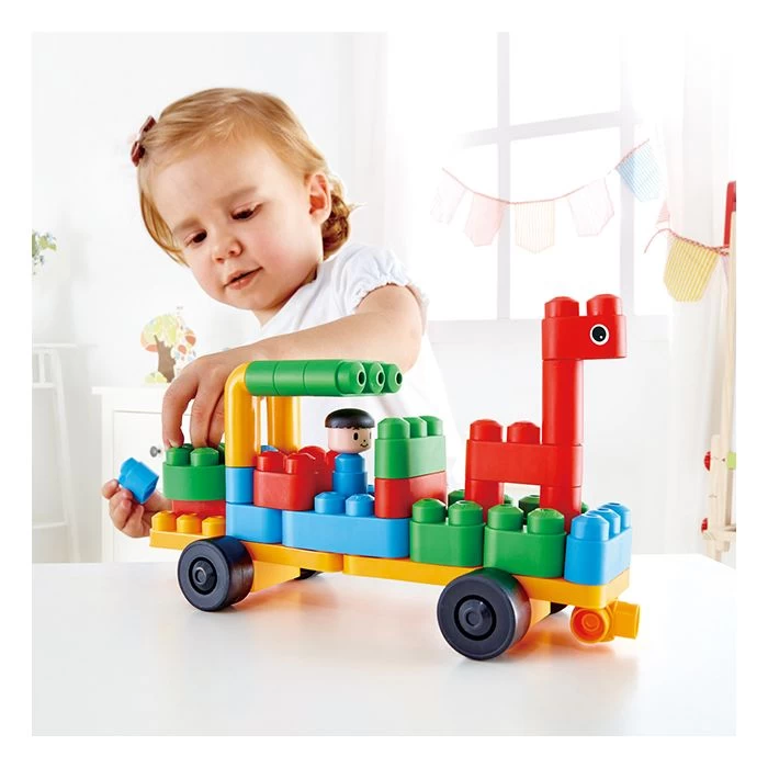 Met Poly M-blokken is het eenvoudig bouwen. Bouw met deze set allerlei interessante voertuigen met dierentuinthema.